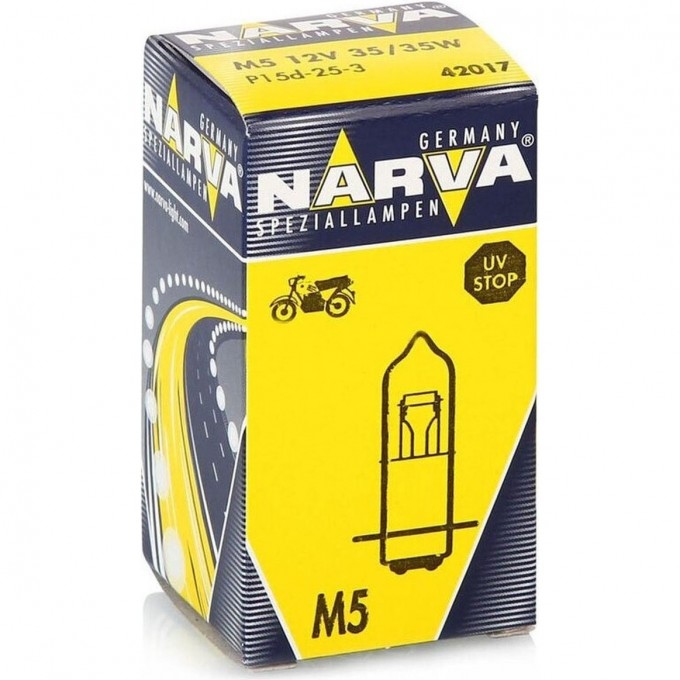 Галогенная лампа для мотоциклов немецкой компании Narva линейки Standart Moto обеспечивает хорошую освещенность дорожного полотна и комфорт в дороге. Эта модель подходит для ближнего и дальнего света фар мотоциклов. Часто именно она устанавливается на заводе производителем и подходит водителям, которые не предъявляют высоких требований к освещению. Она выполнена по типу стандарт и относится к категории М5 с патроном P15d-25-2. Лампа имеет две нити накаливания с номинальной мощностью 35 Ватт для разных режимов освещения. Она работает от бортовой сети 12 Вольт. Эта модель выполнена с соблюдением самых высоких стандартов качества и обеспечивает отличные характеристики светового луча по очень конкурентоспособной цене. Продукт имеет сертификат ECE. Лампа упакована в фирменную коробку. При транспортировании упакованные лампы следует предохранять от механических повреждений.